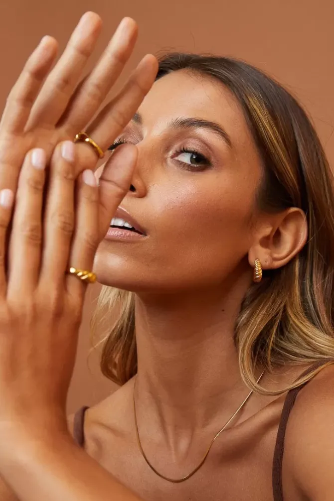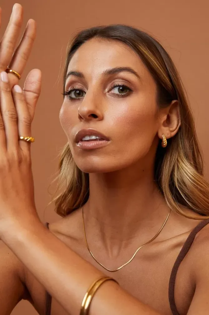 For reference: Dominique wears our Hailey Snake Chain 2mm x 45cm length.