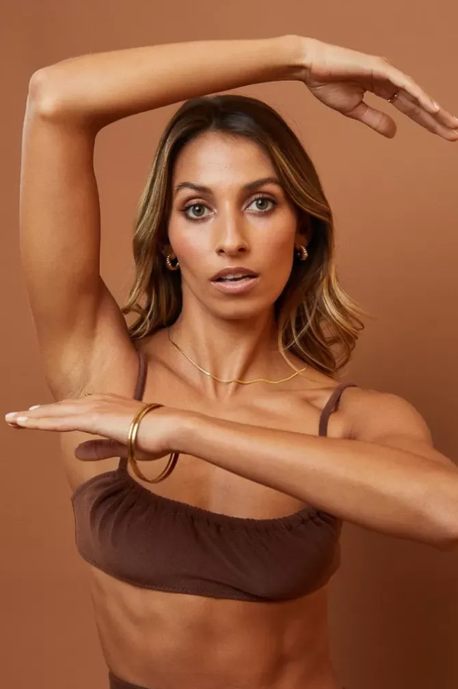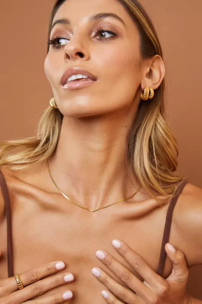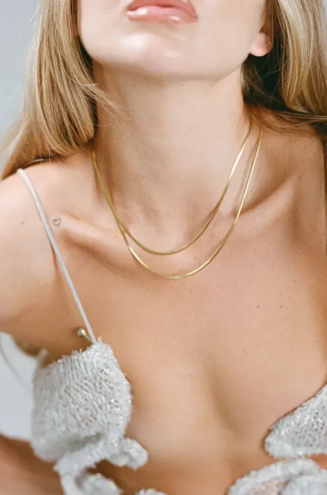 For reference: Dominique wears our Hailey Snake Chain 2mm x 45cm length.